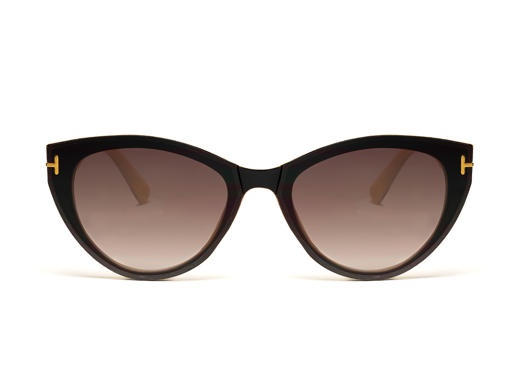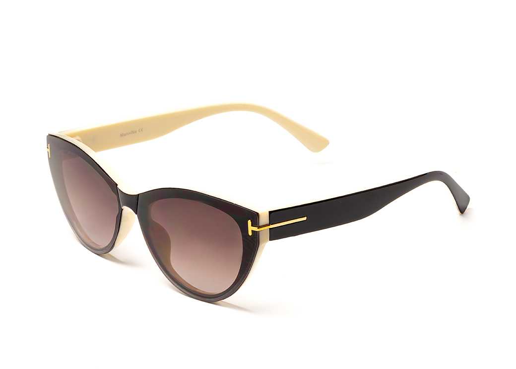 Okulary przeciwsłoneczne w kolorze brązowo-beżowym o kształcie "kocie oko" z lekkim elementem zdobnym.
