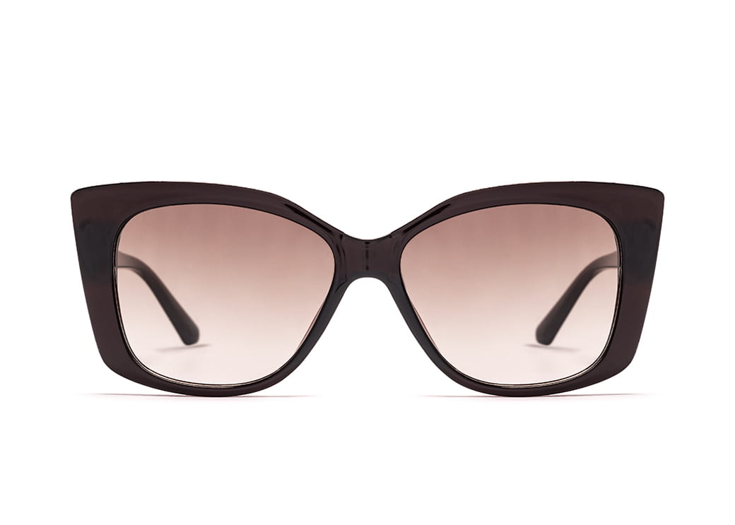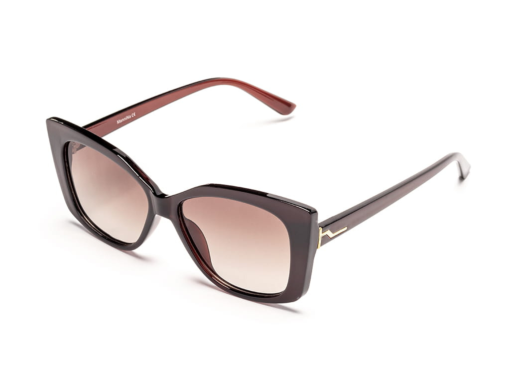 Okulary przeciwsłoneczne w kolorze brązowym o kształcie "kocie oko" z delikatnym zdobieniem na zauszniku.