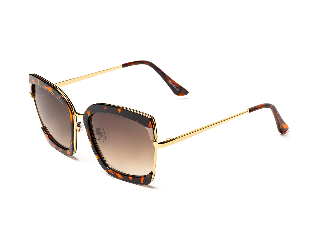 Okulary przeciwsłoneczne damskie o geometrycznym kształcie.Wykonane z plastiku w kolorze brąz panterka, zauszniki metalowe.