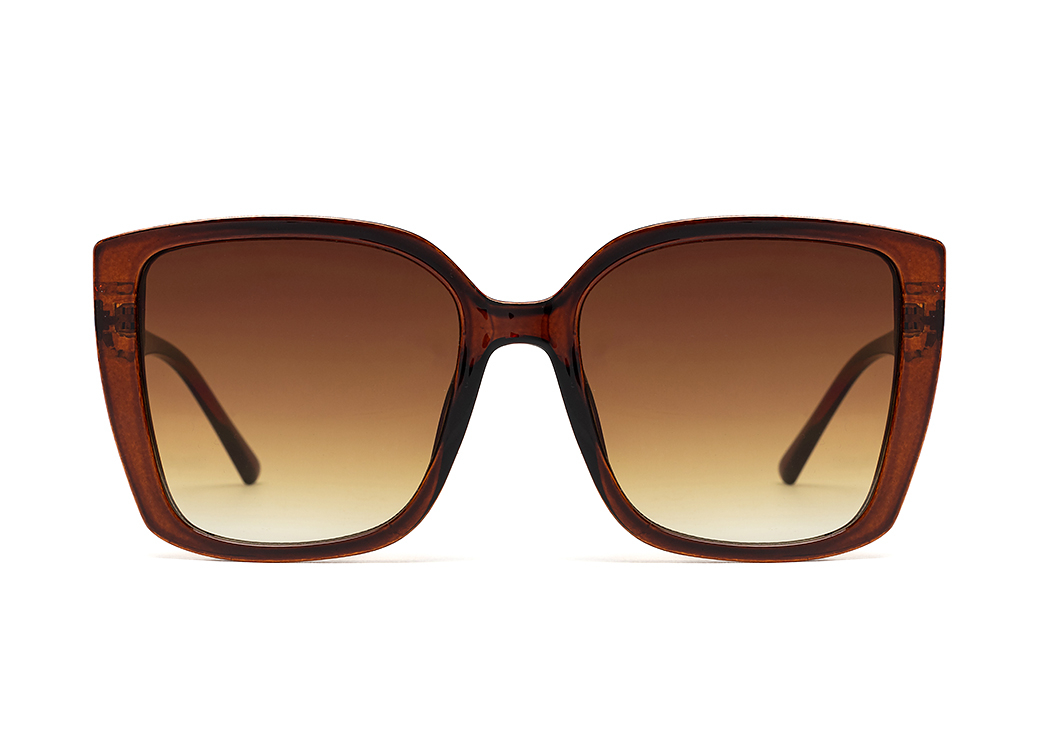 Duże kwadratowe okulary przeciwsłoneczne w kolorze brązowym.Elegancki metalowy motyw na zauszniku.