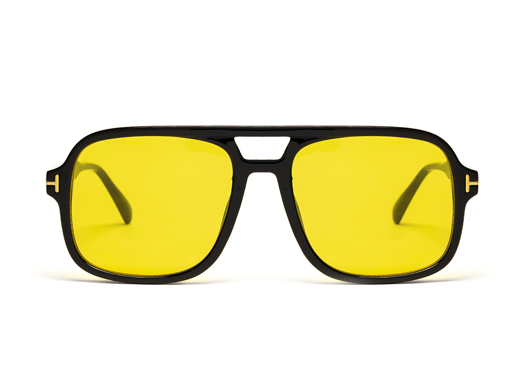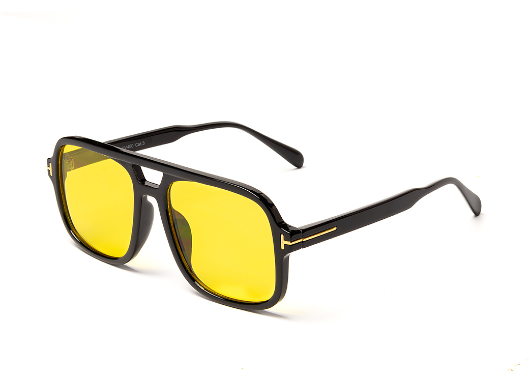 Okulary przeciwsłoneczne o kształcie aviator w kolorze czarnym z żółtą soczewką.