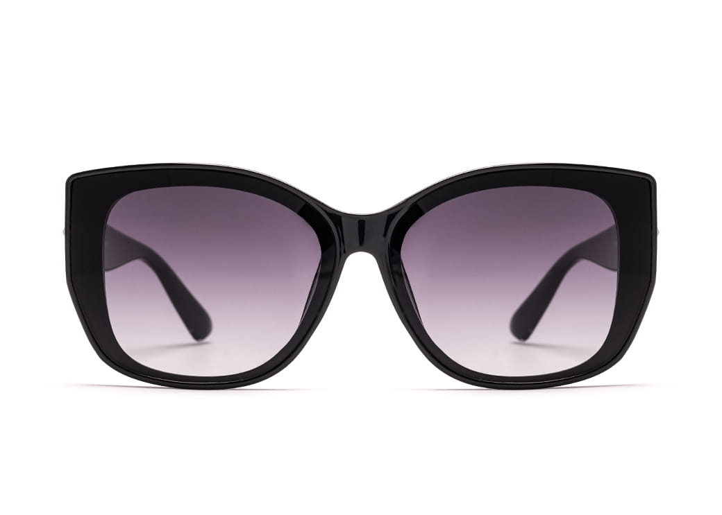Duże okulary przeciwsłoneczne o nieregularnym kształcie w kolorze czarnym.Eleganckie zdobienie na zauszniku.