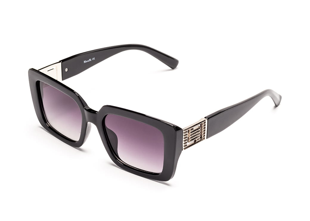 Klasyczne,prostokątne okulary przeciwsłoneczne w kolorze czarnym.Metalowe zdobienie na zauszniku