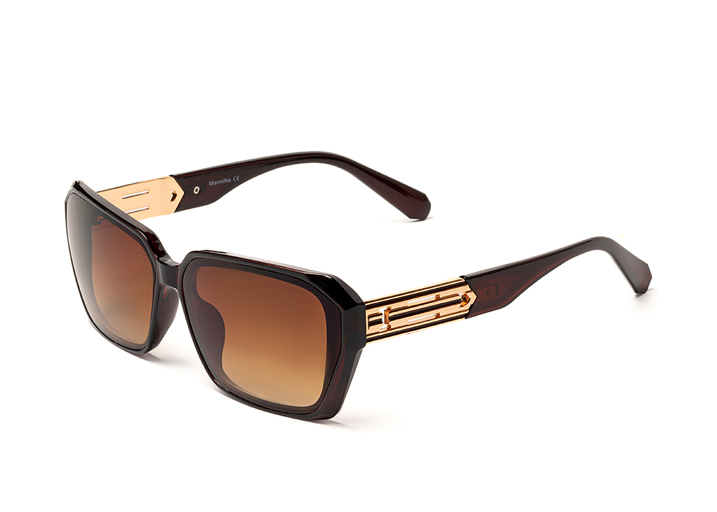 Klasyczne damskie okulary przeciwsłoneczne w kolorze brązowym.Metalowe zdobienie na zauszniku.