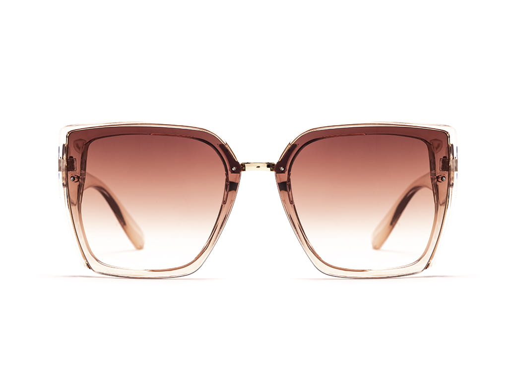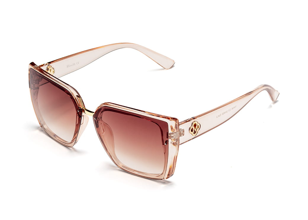 Duże,kwadratowe okulary przeciwsłoneczne z polaryzacją w kolorze beżowym.Eleganckie zdobienie na zauszniku.