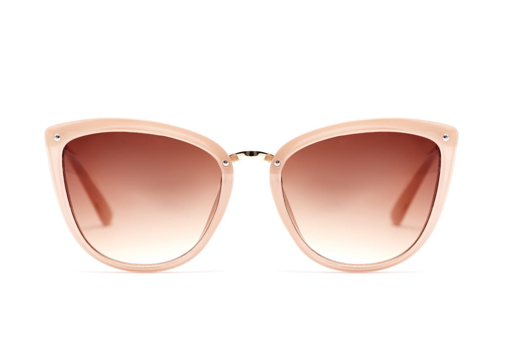Okulary przeciwsłoneczne z polaryzacją o kształcie "kocie oko" w kolorze beżowym.Delikatny metalowy zausznik.