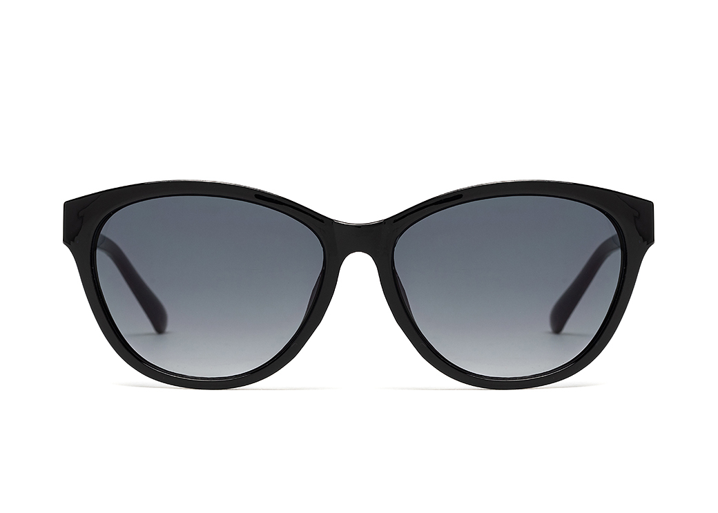 Małe okulary przeciwsłoneczne o kształcie "kocie oko" w kolorze czarnym.