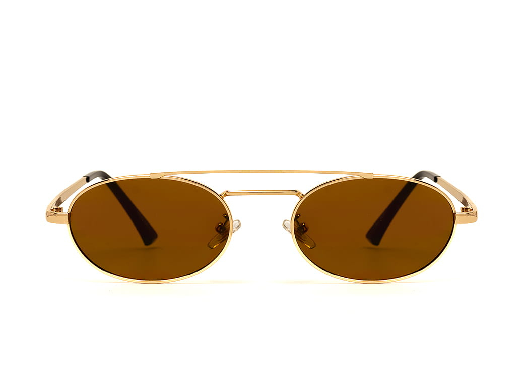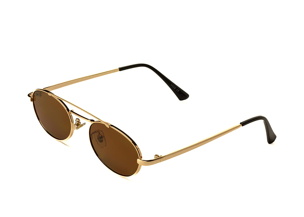 Metalowe okulary przeciwsłoneczne o owalnym kształcie, soczewka brązowa.