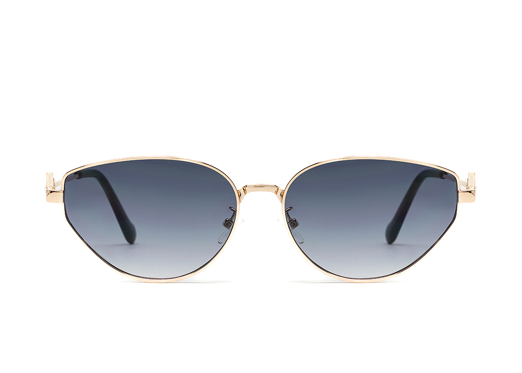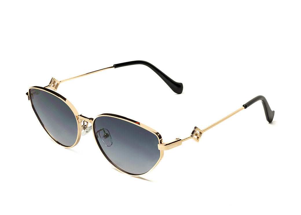 Metalowe okulary przeciwsłoneczne o nieregularnym kształcie,ciemnoszara soczewka.Motyw dekoracyjny na zauszniku.