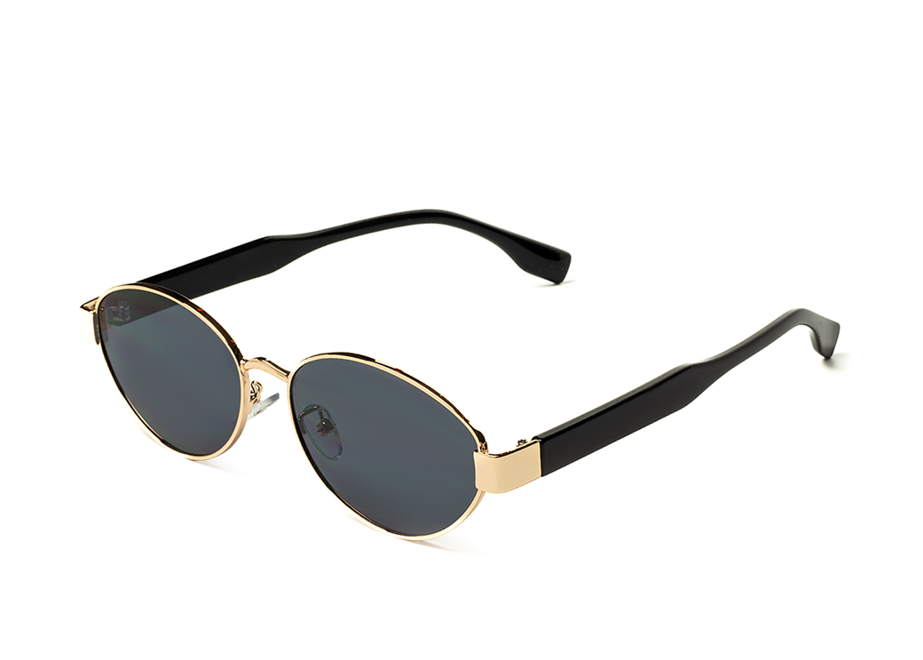 Metalowe okulary przeciwsłoneczne o owalnym kształcie, ciemnoszara soczewka, zauszniki plastikowe.