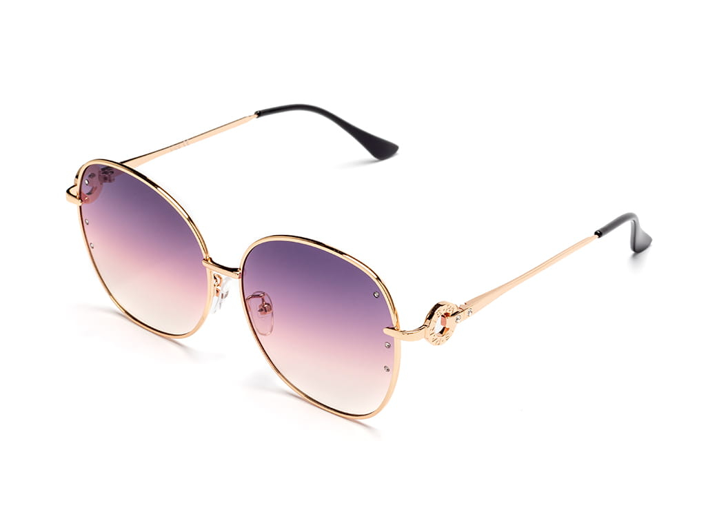 Duże,owalne okulary przeciwsłoneczne, soczewka amarantowa.Gustowne zdobienie zausznika.