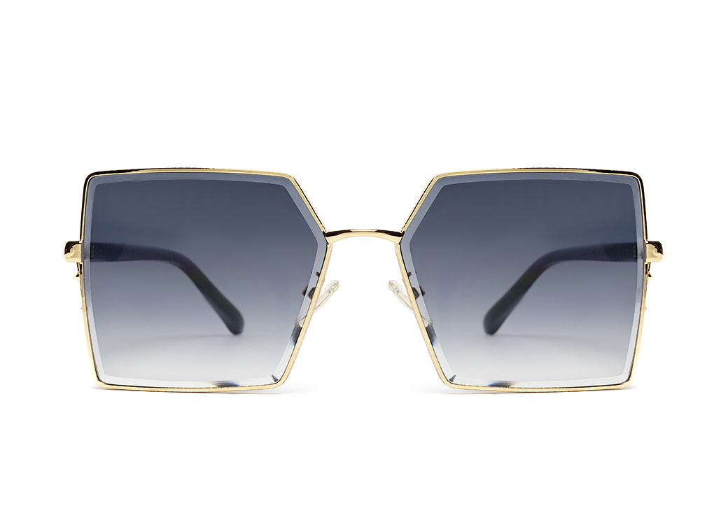 Duże,metalowe okulary przeciwsłoneczne, soczewka ciemnoszara, lekkie zdobienie zausznika.