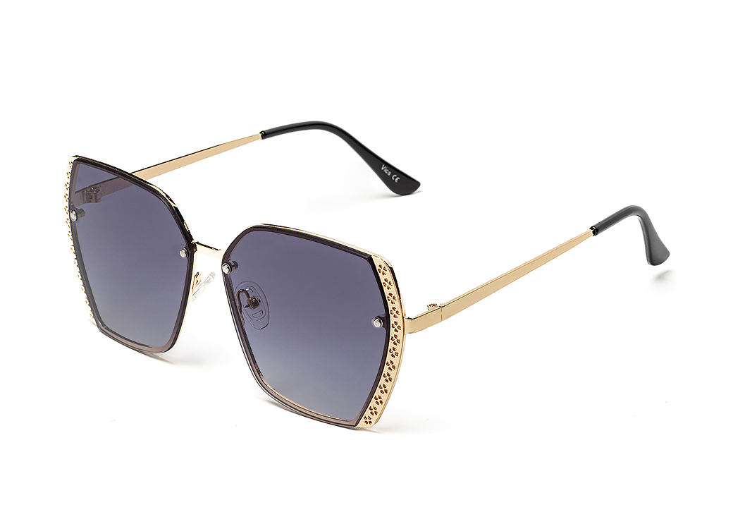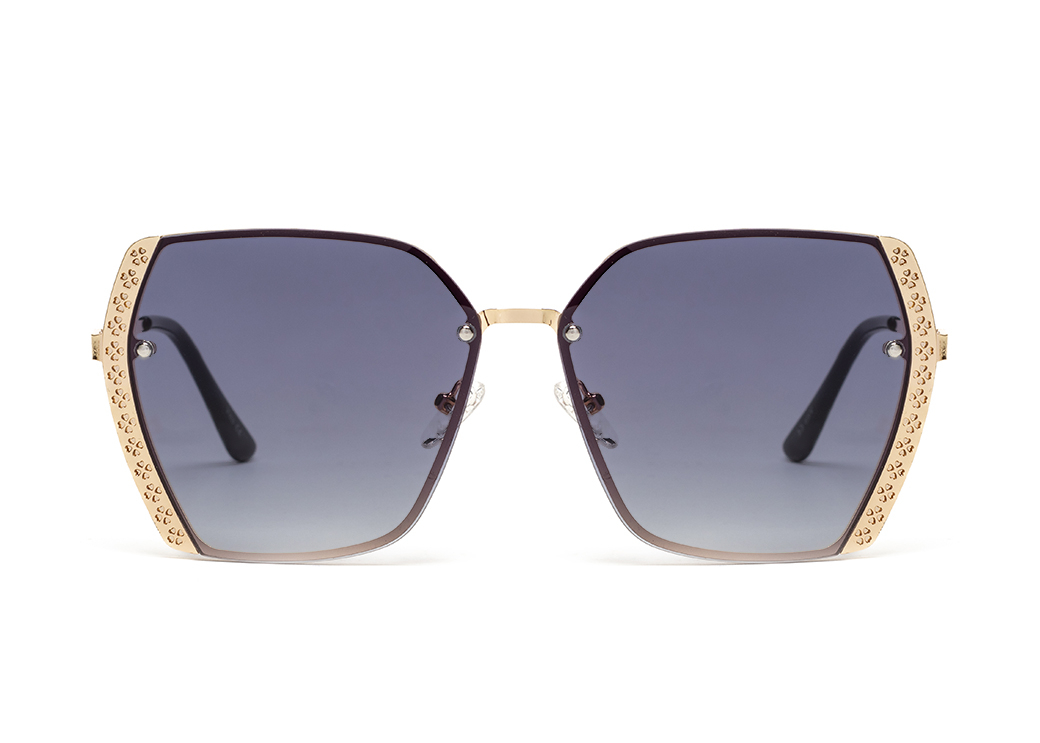 Metalowe okulary przeciwsłoneczne z eleganckim zdobieniem na froncie oprawki.Soczewka w kolorze ciemnoszarym.