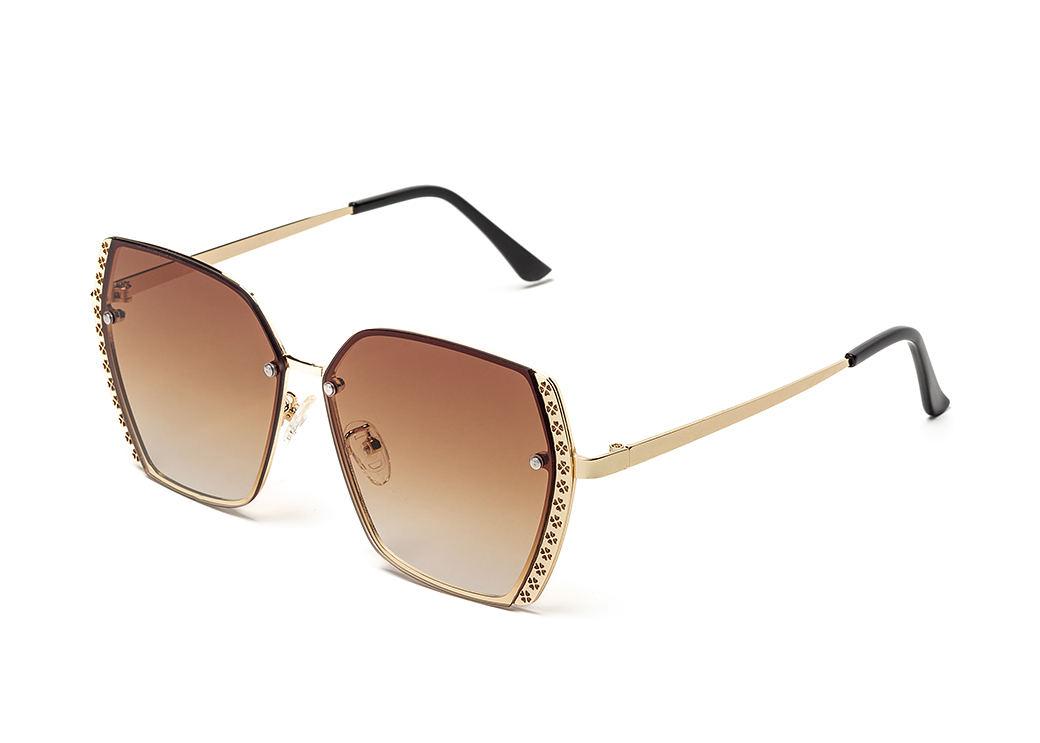 Metalowe okulary przeciwsłoneczne z eleganckim zdobieniem na froncie oprawki.Soczewka w kolorze brązowym.
