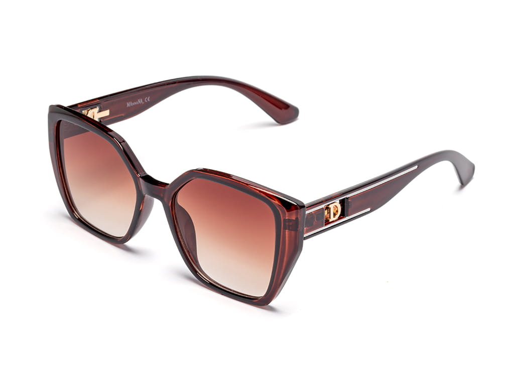 Geometryczne okulary przeciwsłoneczne w kolorze brązowym.Gustowne zdobienie na zauszniku.