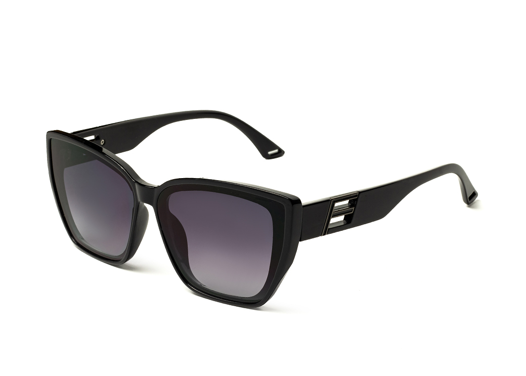 Klasyczne,duże okulary przeciwsłoneczne w kolorze czarnym.Gustowne metalowe zdobienie na zauszniku.