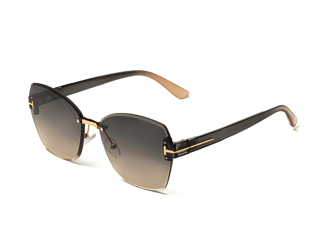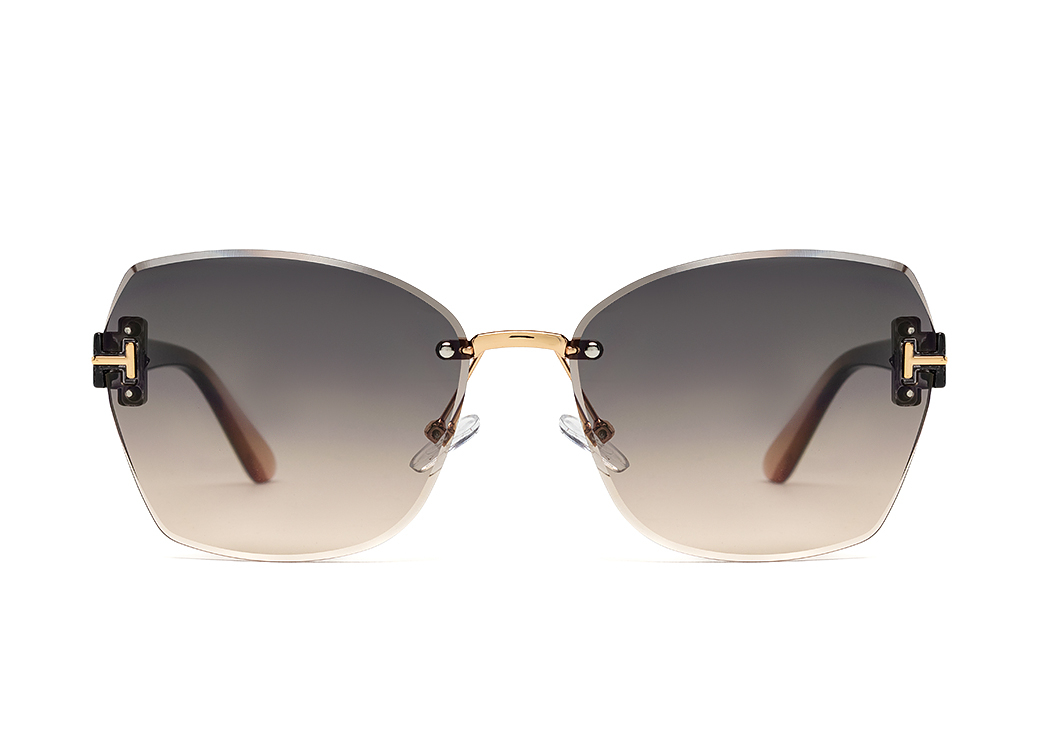 Eleganckie,bezramkowe okulary o lekko owalnym kształcie w kolorze beżowym.Zausznik z delikatnym zdobieniem.