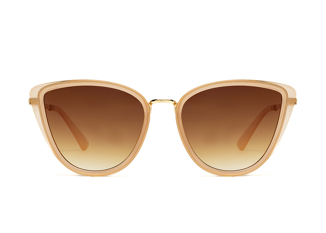 Okulary przeciwsłoneczne o kształcie "kocie oko" w kolorze beżowym.Metalowy mostek i zauszniki.