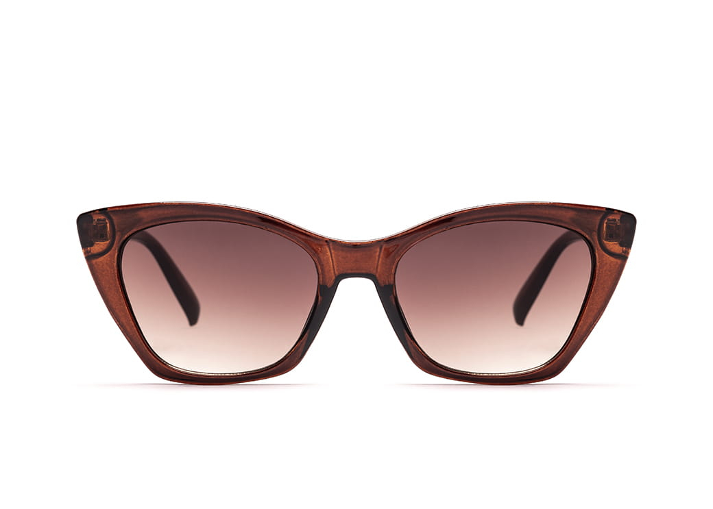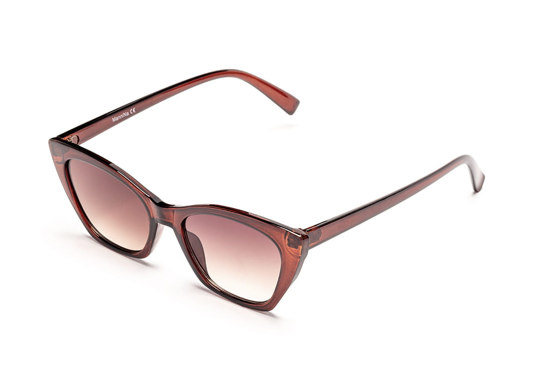Okulary przeciwsłoneczne o kształcie "kocie oko" w kolorze brązowym.