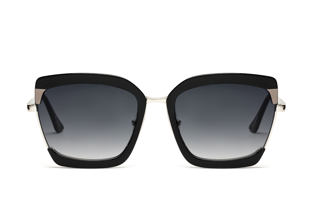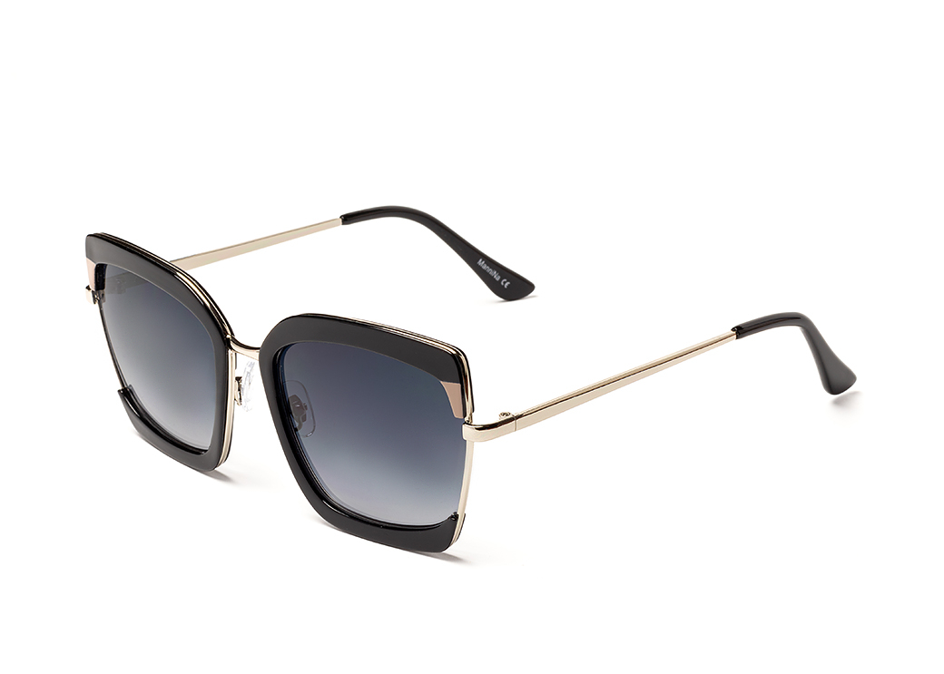 Okulary przeciwsłoneczne damskie o geometrycznem kształcie.Wykonane z plastiku w kolorze czarnym, zauszniki metalowe.