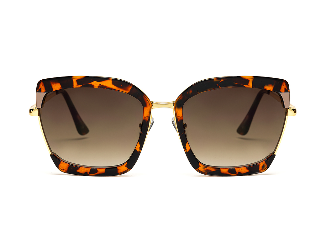 Okulary przeciwsłoneczne damskie o geometrycznym kształcie.Wykonane z plastiku w kolorze brąz panterka, zauszniki metalowe.