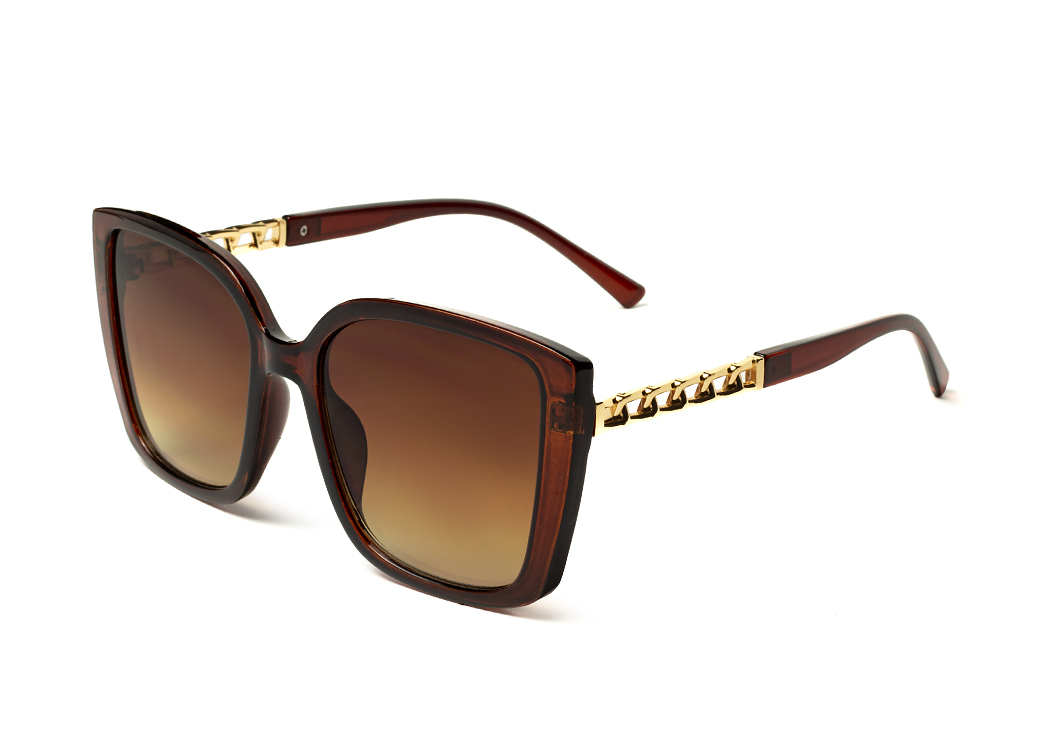 Duże kwadratowe okulary przeciwsłoneczne w kolorze brązowym.Elegancki metalowy motyw na zauszniku.