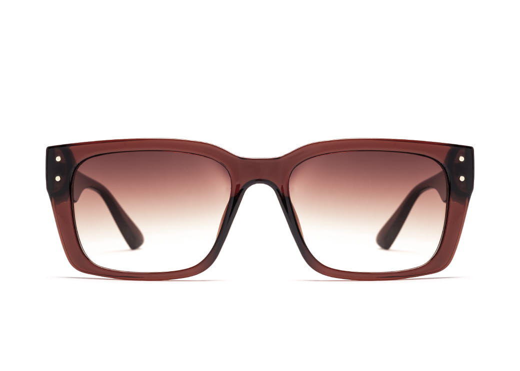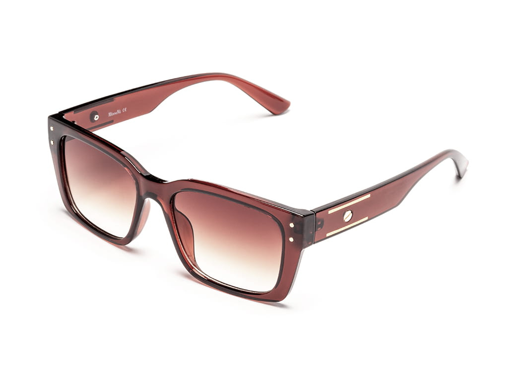 Klasyczne okulary przeciwsłoneczne w kolorze brązowym z delikatnymi zdobieniami na froncie oprawki i zauszniku.