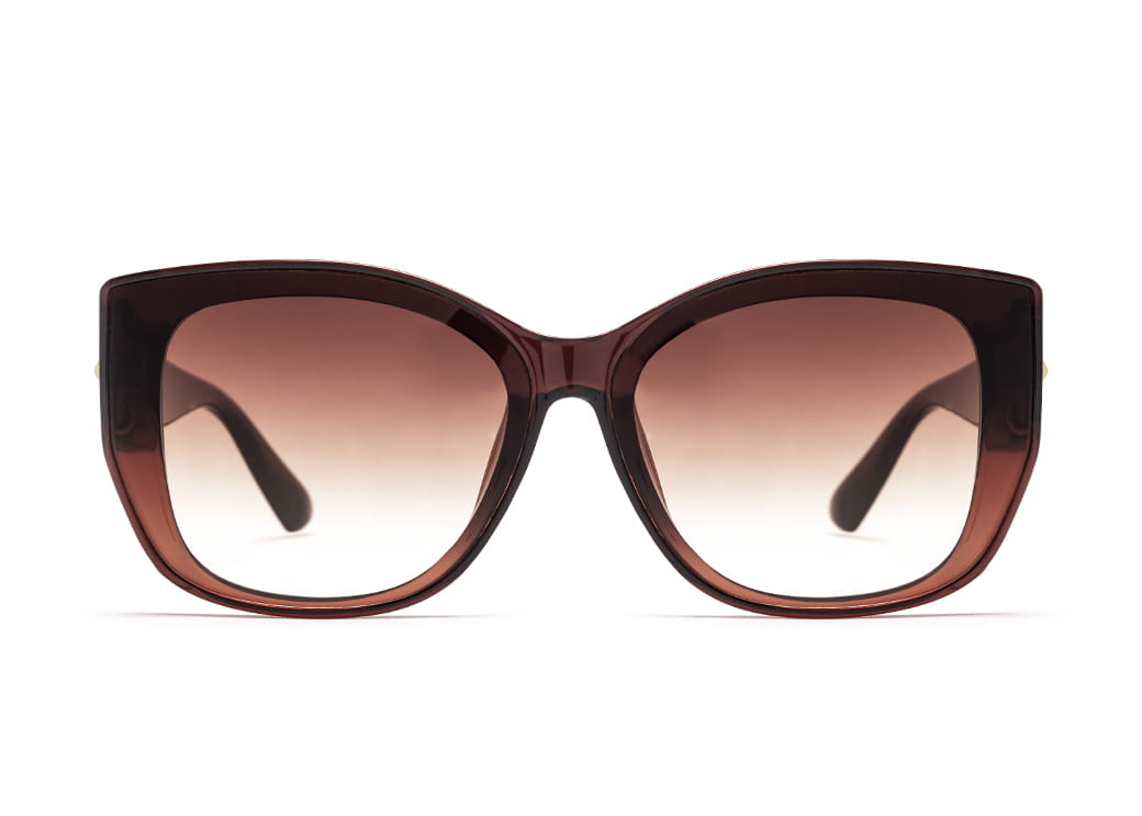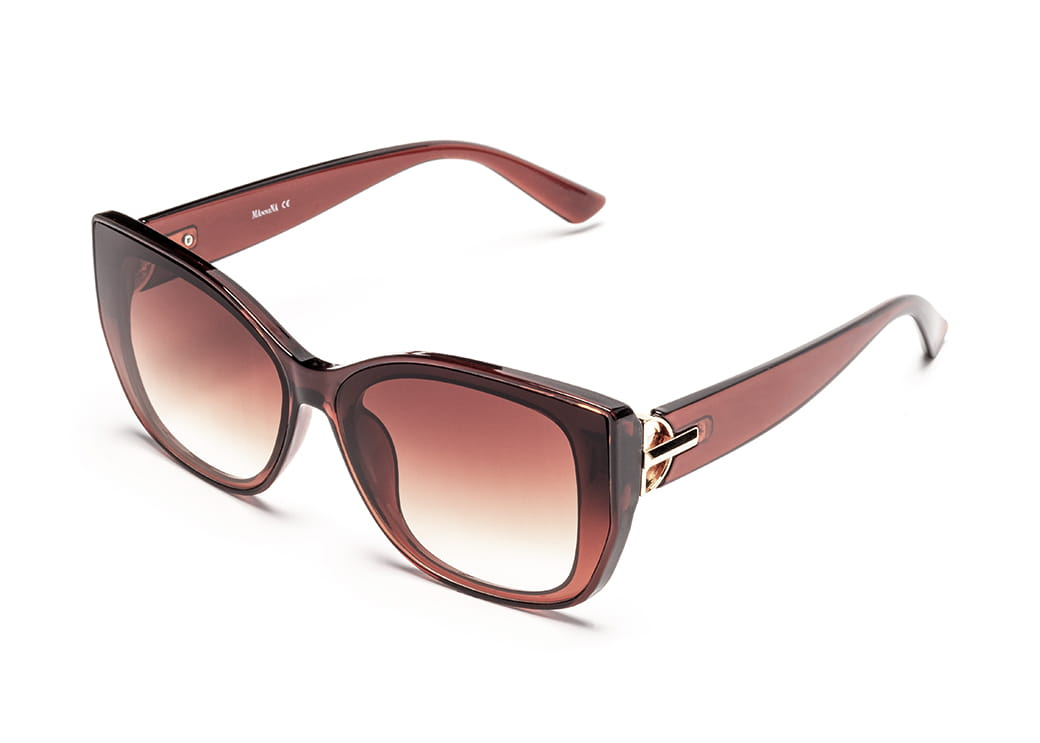 Duże okulary przeciwsłoneczne o nieregularnym kształcie w kolorze brązowym.Eleganckie zdobienie na zauszniku.