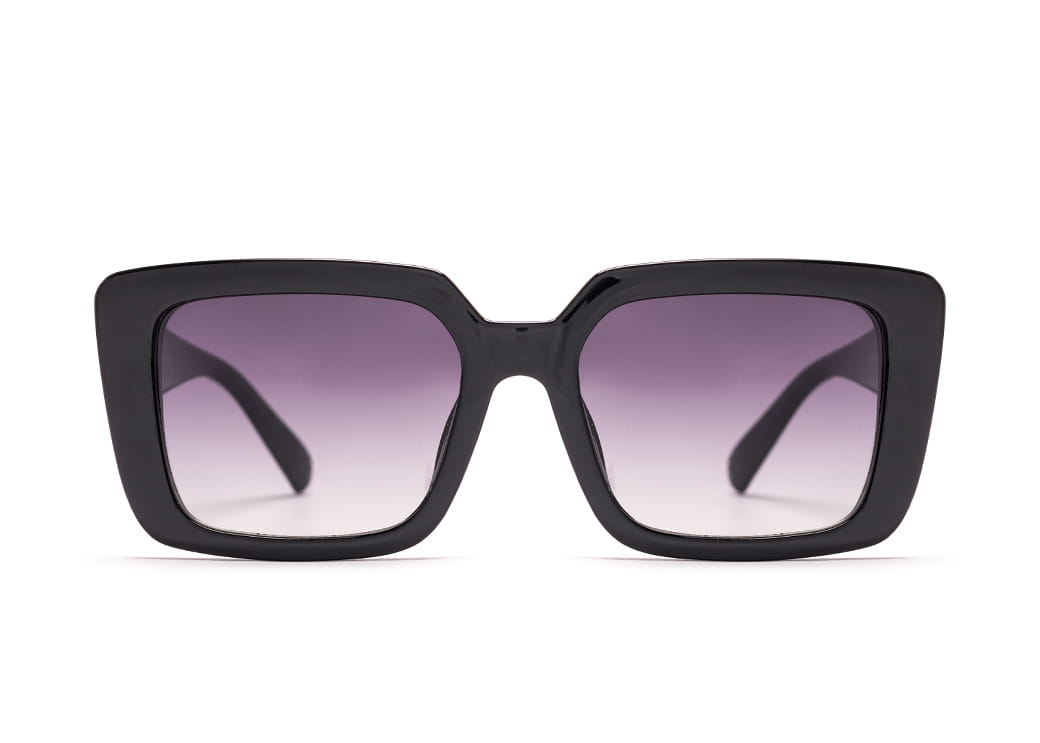 Klasyczne,prostokątne okulary przeciwsłoneczne w kolorze czarnym.Metalowe zdobienie na zauszniku