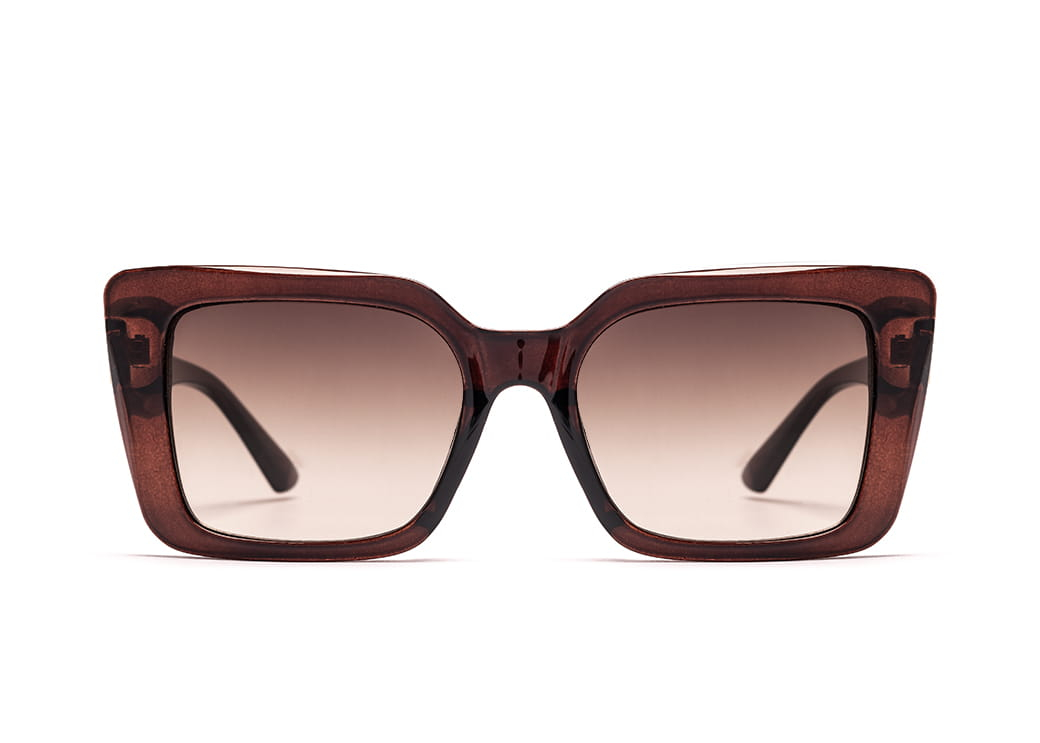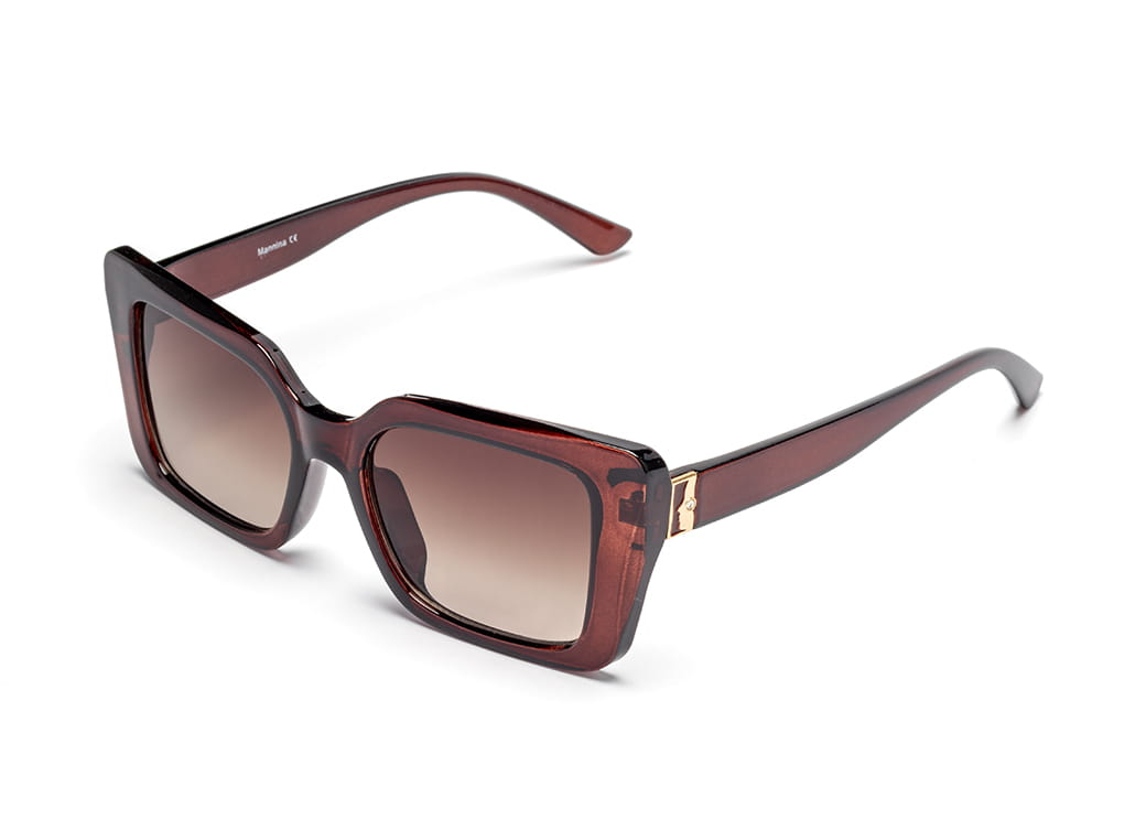 Klasyczne,prostokątne okulary przeciwsłoneczne w kolorze brązowym.Lekki element dekoracyjny na zauszniku.