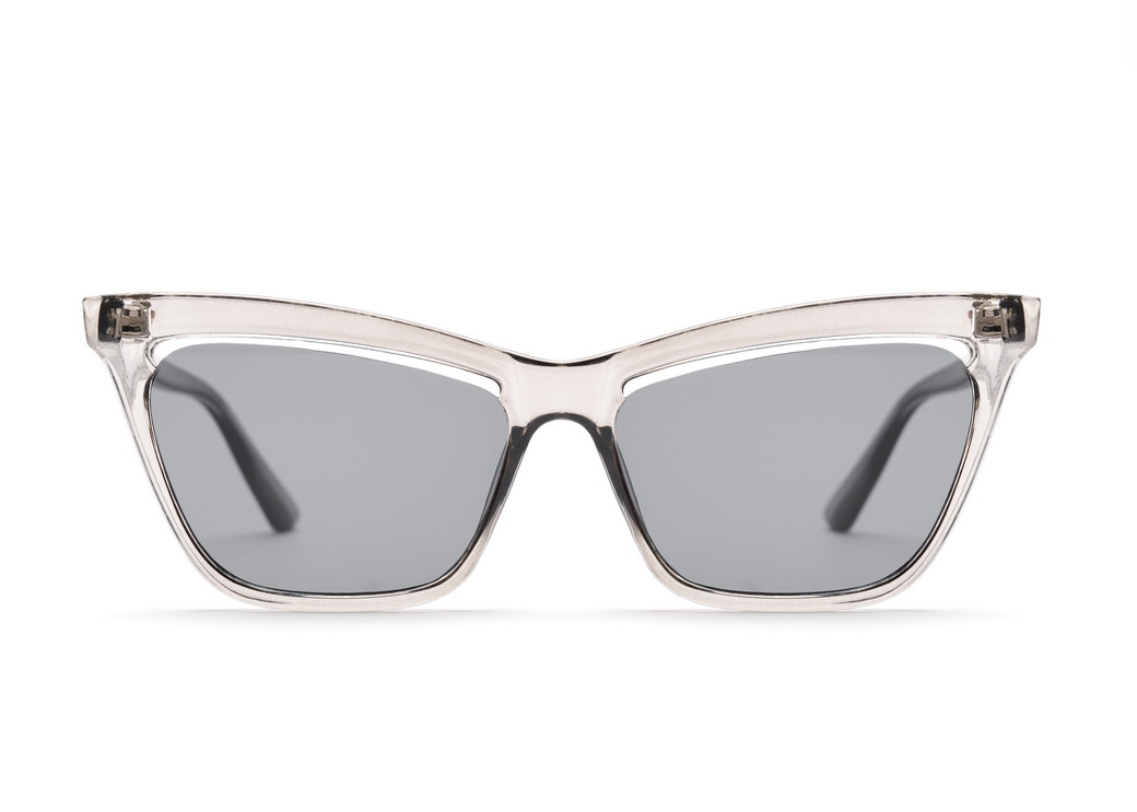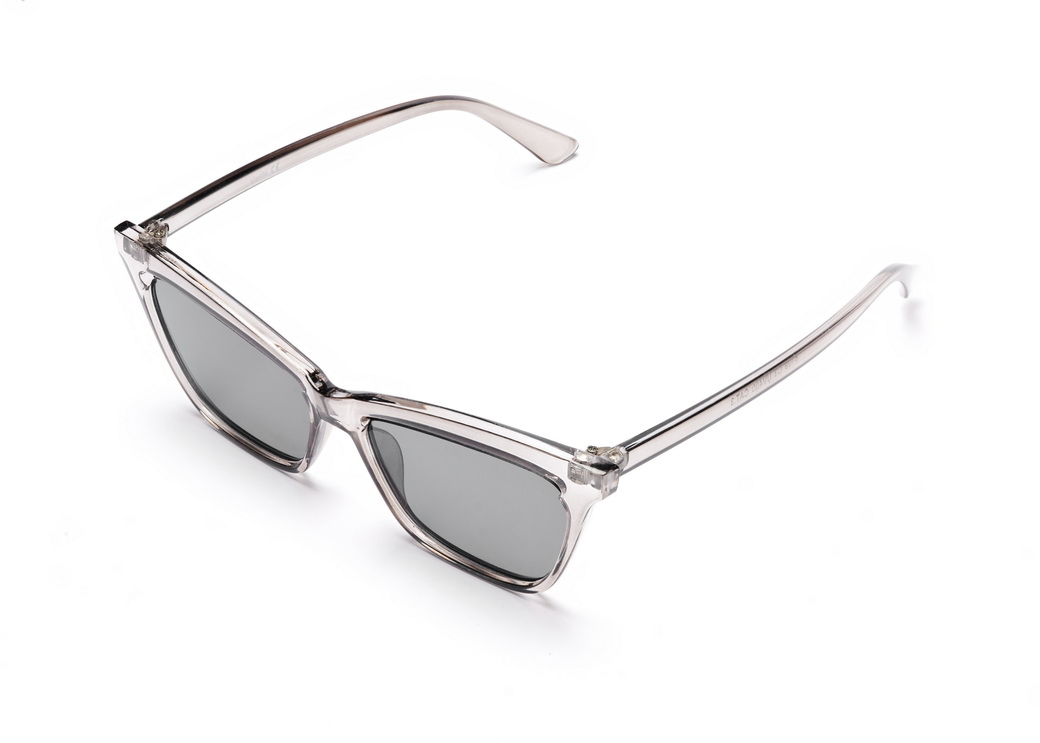 Okulary przeciwsłoneczne o kształcie "kocie oko" w kolorze brąz jasnoszarym.