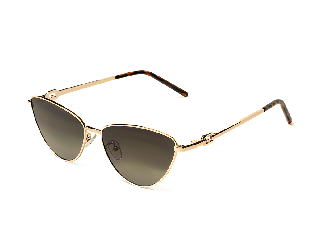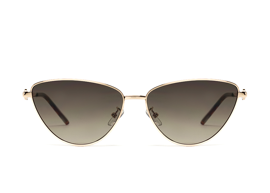 Okulary przeciwsłoneczne o kształcie "kocie oko",brązowa soczewka, oryginalne metalowe zauszniki.