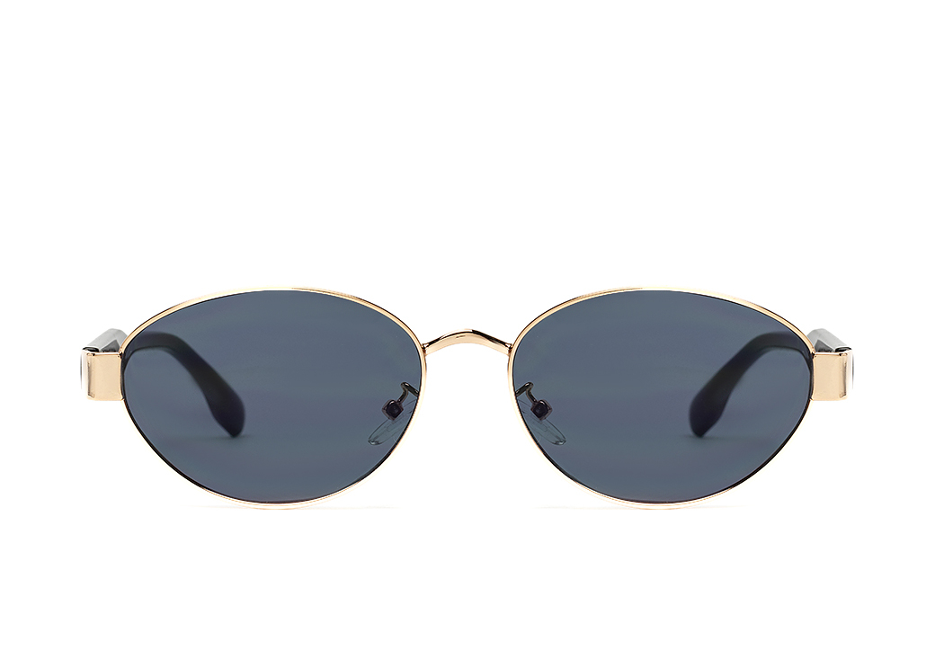 Metalowe okulary przeciwsłoneczne o owalnym kształcie, ciemnoszara soczewka, zauszniki plastikowe.
