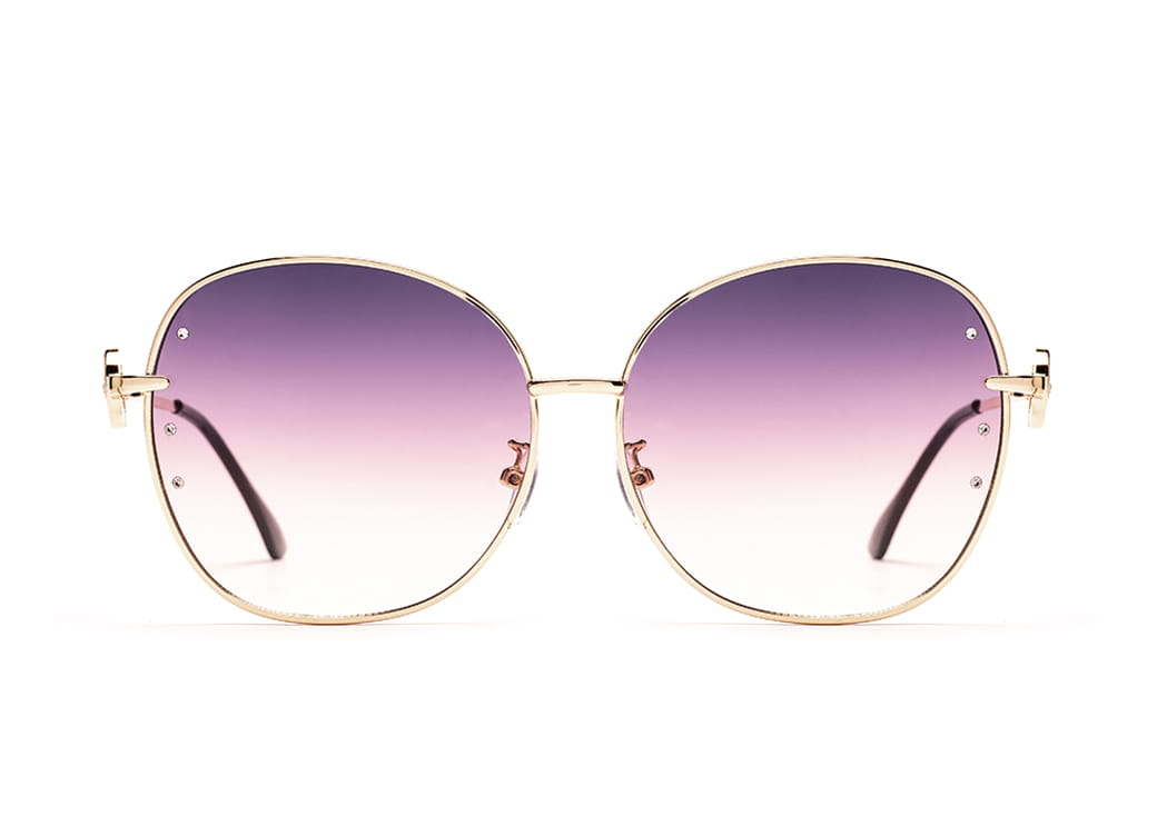 Duże,owalne okulary przeciwsłoneczne, soczewka amarantowa.Gustowne zdobienie zausznika.