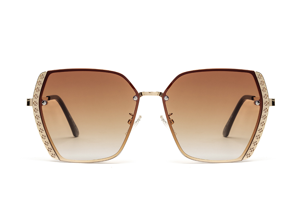 Metalowe okulary przeciwsłoneczne z eleganckim zdobieniem na froncie oprawki.Soczewka w kolorze brązowym.